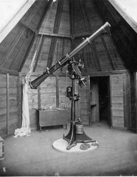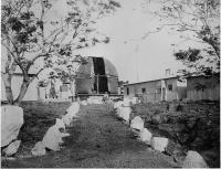 James Ludovic Lindsay, Lord Lindsay of Balcarres (later 26th Earl of Crawford), was a rich and enthusiastic amateur astronomer who was later to re-found the Royal Observatory Edinburgh with the gift of his instruments and Library. He mounted a private expedition to the island of Mauritius for the 1874 Transit, including significantly his expert observer Mr (later Sir David) Gill. This image shows the elaborate temporary observatory erected there. The figure in the centre is probably His Lordship. (RAS MS DREYER 7, p. 37) |