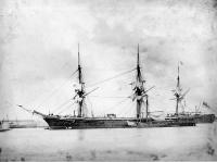 | Major units of the Royal Navy were involved in both the eighteenth and nineteenth century Transit operations. The first voyage of Captain Cook included observation of a Transit from Tahiti. All the major Naval powers mounted expeditions to observe nineteenth century Transits and this took place at an interesting stage in Naval history, roughly half way through the transition from the purely sailing 'wooden walls' of the Napoleonic period to the fully steam powered fleet of the early twentieth century. This is the large steam and sail vessel HMS Volage, which transported the British expedition to the desolate and then uninhabited Kerguelen Island, in the southern Indian Ocean. (RAS ADD MS 96, p. 35) |