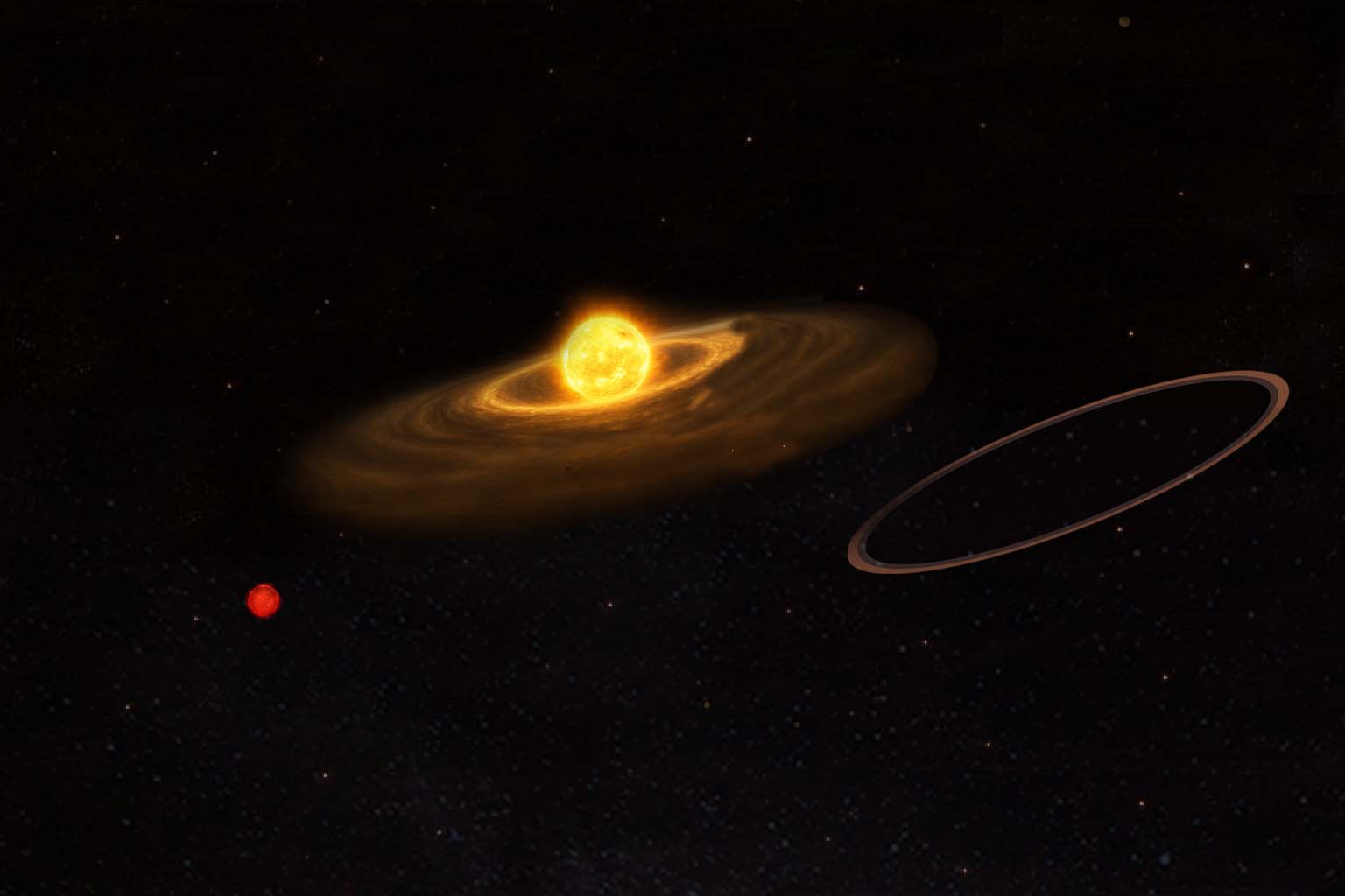 Caption: An artist's impression of ASASSN-24fw after the eclipse is over, where the star is seen shining unobstructed – with its own remnants from possible planetary collisions along with its companion red dwarf star and the dark "saucer".